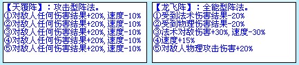 测试目标:5号位对敌人物理攻击伤害+20%。还是类似与天阵伤害加层(对敌人任何伤害结果+20%,速度-10%)大家注意天阵的效果是任何伤害结果+20%,其中就包括了物理攻击伤害~法术伤害以及固定伤害暗器等,而龙阵的五号位+20%物理攻击伤害仅仅是天阵的模仿版吗?还是跟天阵一样的效果?我们带着疑问来测试。。。