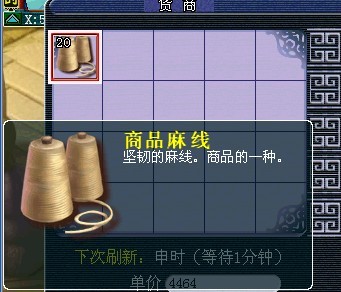 商品棉布:作用和收益等同于扇子,价格比扇子稳定,利润不高,当其他货无法进时可考虑进一些,毕竟长安价刷的一向不是太好。
