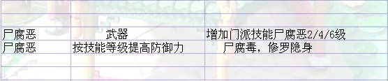 武器的独门组合是尸腐恶,包括的技能是尸腐毒和修罗隐身,并且尸腐恶可以提高防御,尸腐毒可以配合法宝九幽来恢复气血,恢复的多少是跟尸腐恶的技能和九幽的层数有关系的。所以推荐使用独门组合尸腐恶。