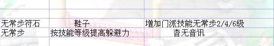 鞋子的独门组合是无常步,也就是回门派的技能。虽然增加躲避力在战斗中有用,可是没必要为此而放弃属性组合,个人推荐选择百无禁忌,满层是提高自身12%对抗封印技能的能力,虽然地府本身抗封,但是我想多加那12%谁都愿意把。