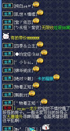 我承认我以前喜欢刷世界频道,别人总认为我在世界频道聊天是为了出名啊、作秀啊。其实我只想找人聊聊天,发泄一下心中对某些事物的不满。可现在很多玩家,尤其是男玩家的眼中,只剩下所谓的经验和金钱、比武、武神坛。我真的对于那些话题没有丝毫兴趣。我每天上网三个小时左右,两个半小时都站在那里聊天了。直到有一天我在世界频道聊天的时候,有一个玩家突然站出来对我破口大骂,说我做作、装纯之类的。我的朋友帮我说话,结果被他说成卖弄姿色收的走狗,我当时看了觉得很憋屈,眼泪当时就流下来了,从那以后我也只在帮派里聊天交流,除了买卖东西外,基本上就不在世界频道上说话了。