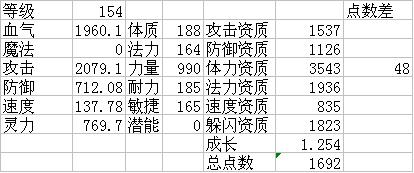 可以看出,其他维度统一后,攻击相当于相差79。对于这个宝宝来说,79的攻击需要加力量点数63点可以实现。(有模拟器的、并且相对准确的,自己可以算出来,但这是其他比较中常见的一个错误)。出于客观公平,不能这样简单计算,还是要调整平衡。实际需要额外多48点。这时由于灵力额外高了14,但法力点数已降到最低,懂计算器的朋友可以看出力量加灵力也是非常狠的。如下图