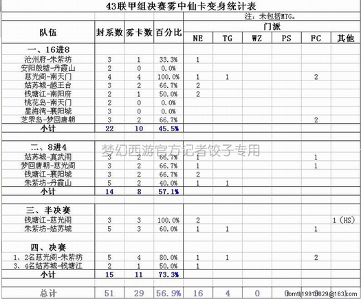 从统计中可以看出,总共16场比赛中,雾中仙卡的出现频率已经超过了一半,达到了57%,已经占据封系变身卡片的半壁江山。更重要的是,在半决赛与决赛中,雾中仙卡几乎成了封系们的主要选择,甚至在半决赛钱塘江与慈光阁的比赛中,钱塘江的HS居然也选择了变身雾中仙!