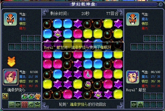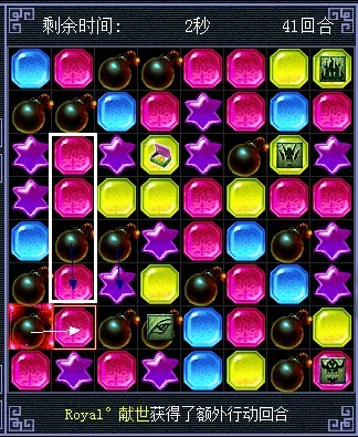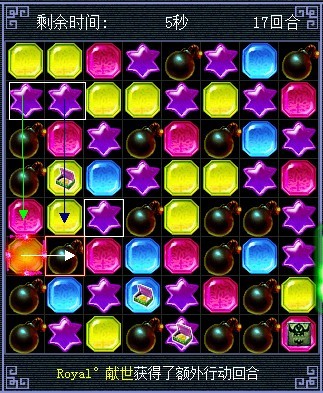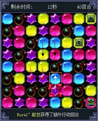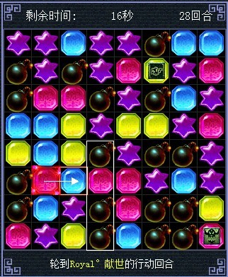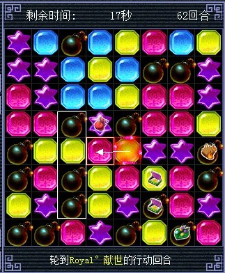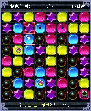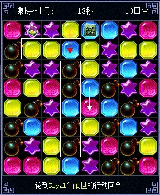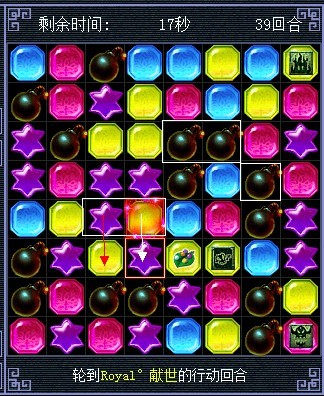 将蓝色的和红色的交换,蓝色的消失后炸弹会连起来,黄色的会往下掉三个也连起来了(白色箭头代表移动的棋子,其他颜色的代表白色箭头指的棋子消失后 其他颜色棋子会往下掉。这么说能明白么