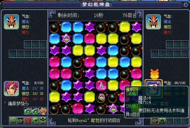 黄色消失后,星星和炸弹就会落下来连起来了。