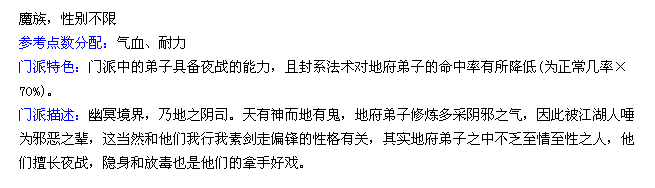 首先门派特色。。官方给出的推荐是血气和耐力 。。我觉得很对。。加点等会再说先说门派特色。。DF的特色最广为人知的就是夜战。。可以说L地府是可以一辈子不用变小夜卡和幽灵参加PK的。。还有一个抗封。。为正常几率的70%。。也就是抗封30%。。这在和封系PK里是很可怕的。。