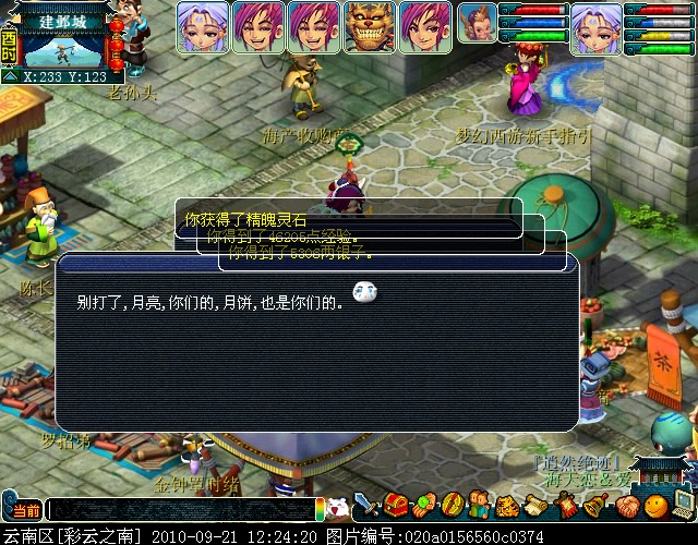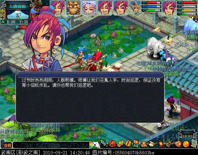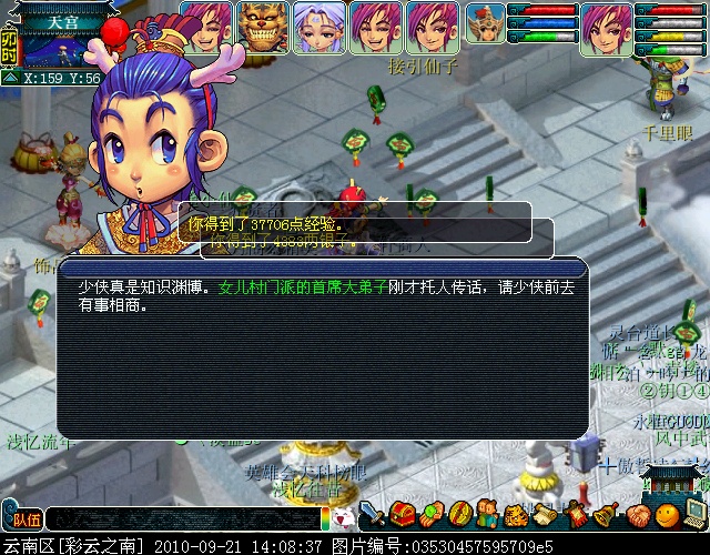 任务流程;玩家可以在“月宫小仙”(长安城232,116)处变身参加活动(如果携带变身效果的话,原先的效果将被清除)。拜访完十二门派的首席大弟子,分别通过他们的考验,再到月宫小仙处报到,即顺利完成一轮任务。