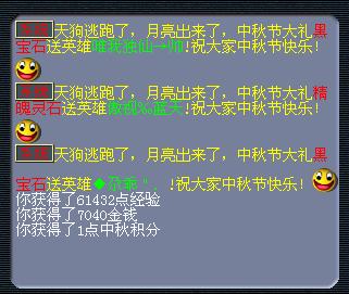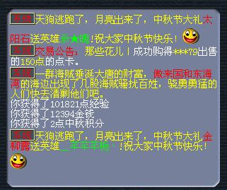 中秋佳节来临,怎能让天狗吞噬皓月,三界兄弟姐妹团结起来,一起驱赶天狗。活动时间内每逢整点,将在建邺城、西梁女国、东海湾、长寿村、傲来国、朱紫国出现天狗和天狗BOSS,齐心协力,护卫中秋圆月!