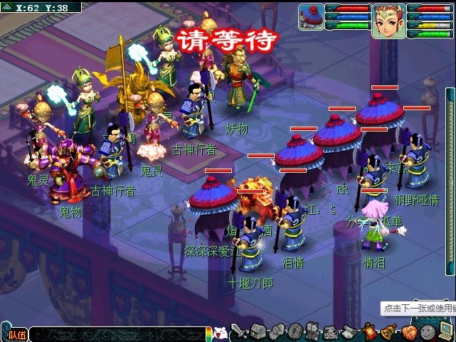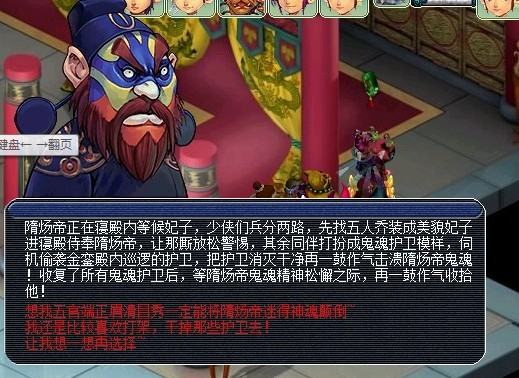 地府阎罗王处进入副本,场景为金銮殿。这里就需要开小号进入副本了。在场景右下角的NPC领取任务。大号选择变身护卫然后杀死分布在大殿吸血鬼摸样的护卫,小号选择变身,取悦隋炀帝,这里说难其实也不难,我在过这关的时候,让队里的人在行囊里准备好血蓝伤药,然后就点自动杀,经常看几眼血蓝就行,然后专心用小号取悦隋炀帝。