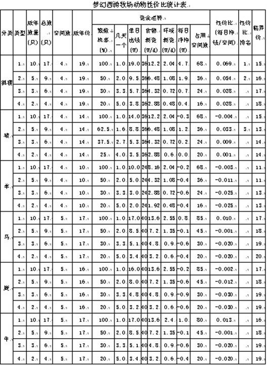 以上四种类型可根据自家牧场大小对动物进行分配,下面对这四类型进行对比分析,计算出每种动物、每种类型的每日效益: