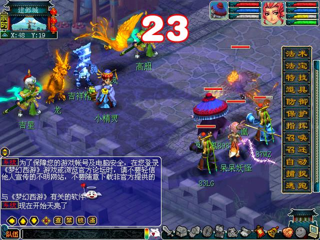 每小时各地都会有烟花和“捣乱的年兽”出现,在战斗中使用道具“七彩烟花”进行驱赶。在驱赶时有一定几率获得“年兽角”和“年糕”。年糕可以用来提升召唤兽的寿命,年兽角可以用来向长安皇宫内的房玄龄换取奖励。
