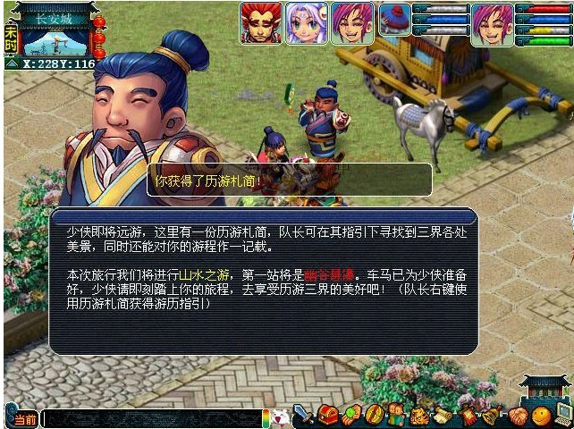 活动介绍:活动时间内,玩家可在驾部郎中处领取任务。领取时将获得一份“历游札简”,作为出游时的指引,右键点击历游札简将获得出游提示。
