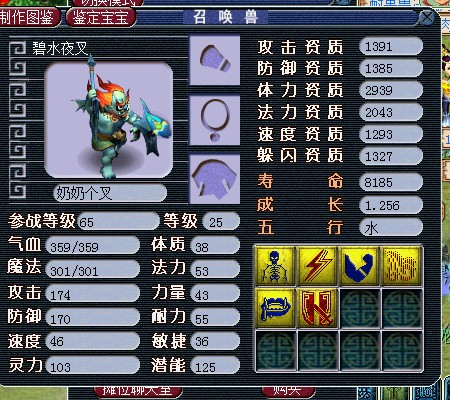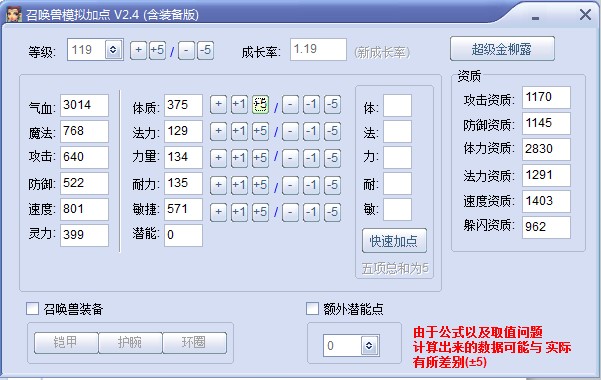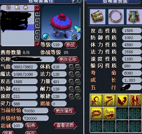 可见,召唤兽的速度仅仅与速度资质和投入速度的属性点数有关,而前面我们分析法宠时提到过,召唤兽的气血体力资质影响的有限(以119BB为例,1000体资影响119气血),主要看成长率与投入的体质点数。