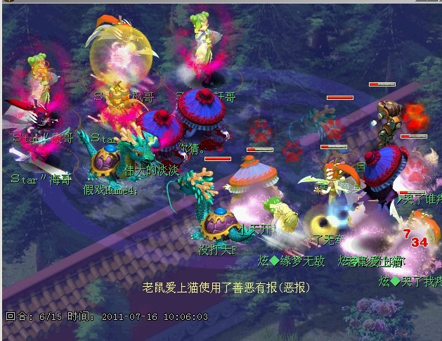 大家仔细看一下,地6回合,这个叫老鼠爱上猫的吸血鬼是使用了善恶有报技能。