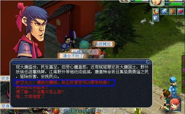 4、“皇宫护卫”(长安城210,182)处增加针对10——30级玩家的探访奇闻任务,每天最多领取50次,在部分服务器测试;