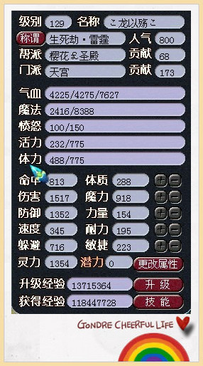 小记:天宫在加点和定位上一直是众玩家争论的焦点。作为一个129的比武天宫,首先谈谈对天宫这个门派的感受!你为什么会选择天宫这个门派?天宫最初吸引你的地方是不是可以轻松单挑环怪?还是剧情超级技能“5雷轰顶”?