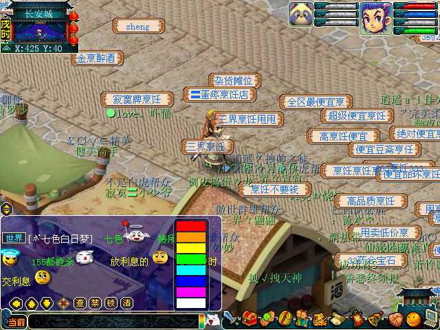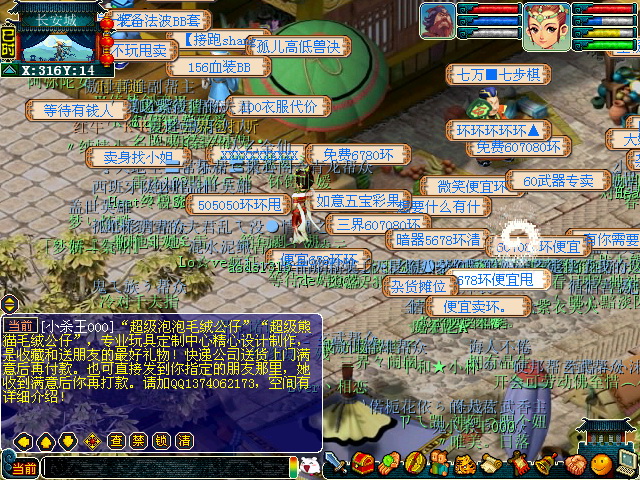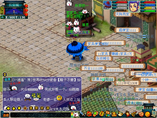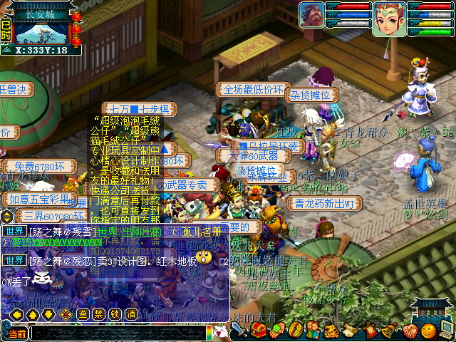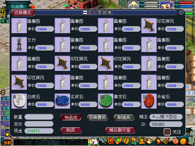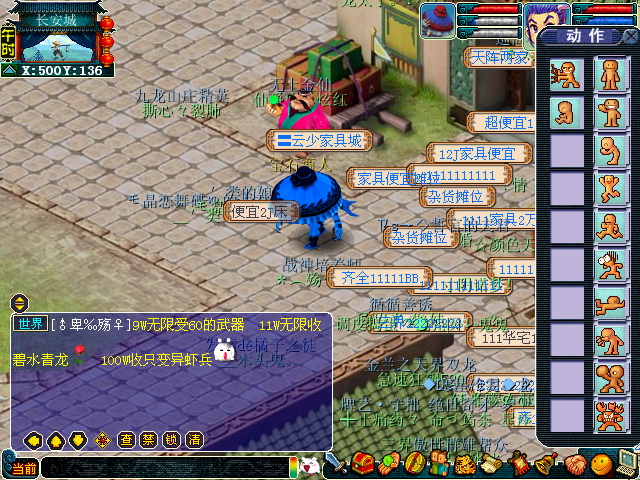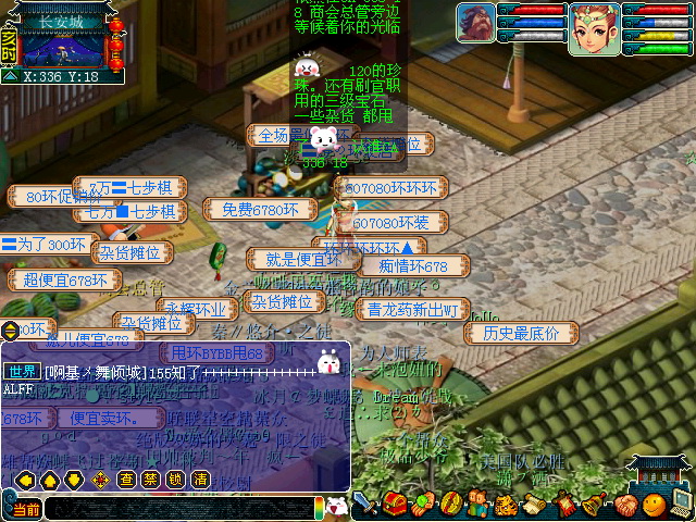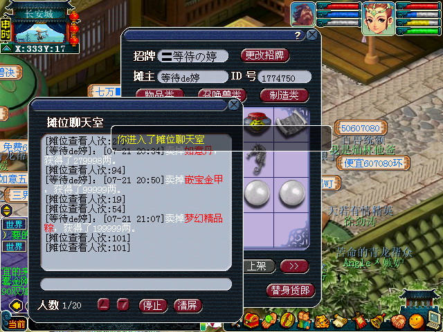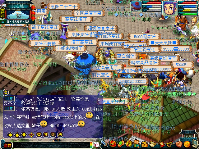 这么多的位置,那么多人的摊位,你想在哪里?哪里才能够显眼?并且财源滚滚呢?卖家具的话,家旁边位置已经是人满为患了,所以我们不仅要在摊位名字上另辟蹊径,而且位置的选择也很关键,那么我比较偏好选在宝石商人旁边。为啥呢?跑镖的人,要从这里路过,取宝图的人也要在这里,那么注定你的收视率和别人的收视率不一样了,那么地利都有了,还有两点是什么呢?人和与天时,现在流行一句话,酒香也怕巷子深,也就是你没有喊话的话,没有适当的宣传的话,别人也不会特别关注你的,所以世界喊话也是一种技巧和艺术。何谓天时?天时即是在适当的时间做适当的事。你懂得我说的