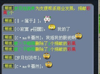 又捐了2个,商人的话还没说完,副帮主的霸权行为就来了,这年头副帮主伤不起,有点权力就滥用.自己要不到的就删掉,这简直就是有的无良公务员的优良作风哦。