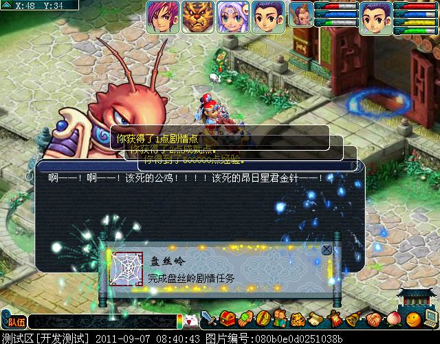 【杀到一定时间,应该是随机的吧,会提示用金针破除蜈蚣精的无敌状态,这应该和明火珠之影任务一样,破除状态后才能杀死蜈蚣精,直接把金针当暗器对蜈蚣精使用即可。BOSS太大,把上面两个小怪完全挡住了……蜈蚣精气血33800,小怪气血也有2W3的样子,蜈蚣精喜欢破血,破碎,弱点~有点厉害,不过组点高级的鸭梨也不是很大】杀完得到2点成就点、1点剧情点、50W经验
