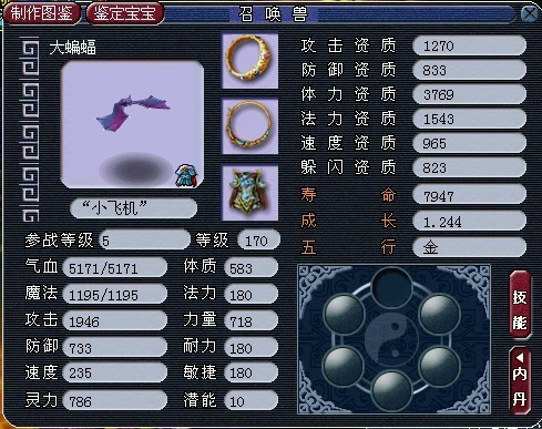 在没开内丹之前,我是一个比较喜欢收集个性宝宝,例如多技能的巨蛙和蝙蝠,而这个力劈的大蝙蝠是我最喜欢的召唤兽之一,成长爆了,明年在吃10个力元宵就可以成品了,但是这个万恶内丹却毁了一切