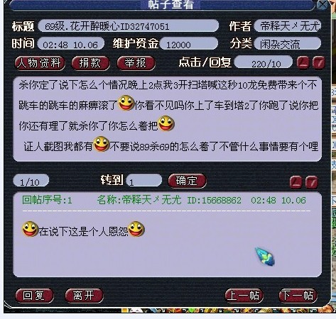 水泊是个鬼区 晚上组队扫塔要组队半个多小时。但是69的人跳车了。无尤很生气,于是发帖子要个说法,并且注明是个人恩怨。