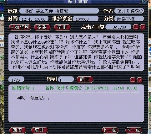 我是山东二区的一名普通玩家。这几天在我的区发生了一件很不公道的事情。我仅以一个旁观者的身份,向大家叙述一下我们区里的黑暗,看看那些平时道貌岸然的打好怎么欺负小号的。