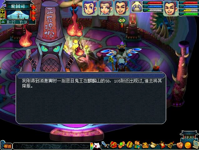 100级以后的朋友如果觉得钟馗给的捉鬼任务太简单了,别急,你还可以到在轮回司找到***(27,11),领取更有挑战性的鬼王任务哦。奖励更加丰富多彩,除了彩果,强化石之外,更推出了分解符,可以分解装备,变废为宝。