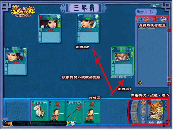 3、大家开始轮流摸牌,出牌,通过各种牌完成进攻及补给。当一名角色当前血量为零时,这名角色即被击败。