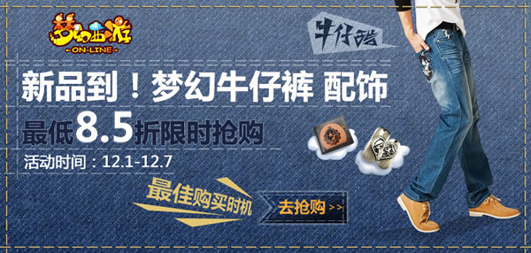 终于盼来啦!《梦幻西游》潮爆百搭牛仔裤、配饰正式开售啦!最潮的设计风格、最酷的款式,搭配梦幻经典元素,剑侠客、龙太子、骨精灵、龙龟……绝对有你的最爱!现参与新品预售抢购,可享最低8.5折限时超值特惠,四重好礼等你来!最佳购买时机不容错过,让《梦幻西游》时刻伴你左右吧!