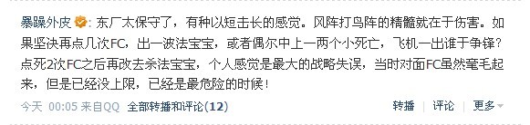 文字版:东厂太保守了,有种以短击长的感觉。风阵**阵的精髓就在于伤害。如果坚决再点几次FC,出一波法宝宝,或者偶尔中上一两个小死亡,飞机一出谁于争锋?点死2次FC之后再改去杀法宝宝,个人感觉是最大的战略失误,当时对面FC虽然毫毛起来,但是已经没上限,已经是最危险的时候!