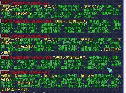 其余16强为龙岗龙园、碧海银沙、黄鹤楼、海纳百川、花样年华、赵王城、德阳文庙、青山绿水。以上队伍升入乙级。