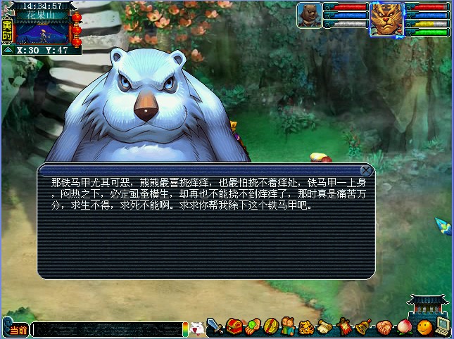 归真堂虐熊的疑云未散,各方的评论与吐槽自然是一波接一波,这其中最令人叫绝的,莫过于将此事植入游戏中并加以吐槽——有玩家在玩网易旗下的网游《梦幻西游》时,碰见了一只可爱的白熊,白熊向玩家哭诉被活取熊胆的悲惨经历,并请玩家帮忙卸下身上的“铁马甲”治疗伤口,完全再现了整个“归真堂活取熊胆汁”事件的始末。从玩家提供的截图来看,这只憨厚的大白熊脸上布满了无奈,其悲惨的遭遇更是让众多玩家怜悯不已,同时也对这一事件颇为愤慨。“这样的做法确实太惨无人道了。”提供截图的玩家“小小虎头怪”如是说。