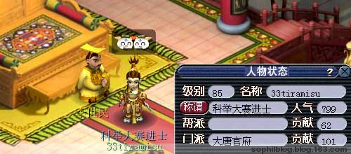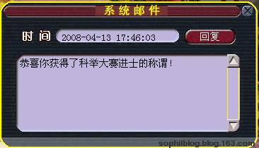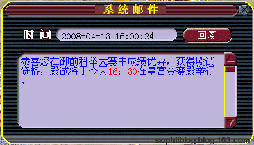 从软件上来说,我所总结的题库已经达到一定的数量,自己本身的反应能力也不弱,但每次都只有看别人殿试,原因根本就在于硬件上,机器配置和网速。科举前专门更新机器,酷睿双核外加2G内存 ,当时我还给熊熊夸海口说,这个月科举我一定会中举,看来的确不是吹牛。但关键的还有一点网速,进入殿试是我姐姐的号,在科举开始我就第一个冲出建邺,那种感觉真是很爽,神速的奖励是金柳露; 而我自己的号是最后30分钟参加,从答题速度和反应程度来说比第1个号答得更好,但也只是神速,得了变身卡和灵石,无缘殿试。