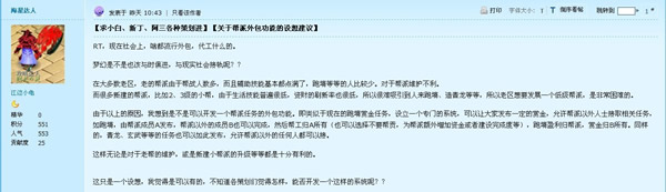 昨天有玩家在官网提出了自己的一个新想法,那就是帮派外包制度,下面是原文