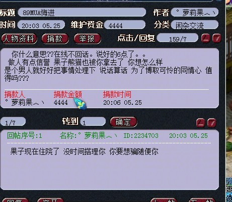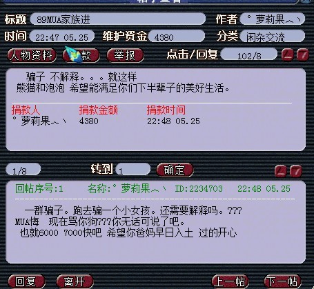 事件的主角,1两卖出泡泡的女玩家想找89DT协商用熊猫换回泡泡,结果熊猫给了对方,对方就没有给泡泡,就此被骗。以下是该区论坛截图。