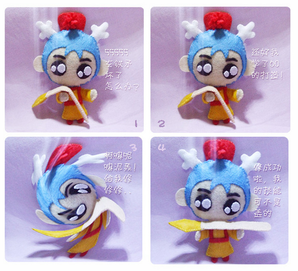 开始做的是表情包子,由于表情实在太多,所以只选了几个自己喜欢的做。然后就做梦幻孩子,现在是做梦幻人物,由于自己的游戏角色是骨精灵和蛾子,所以只做了这2个,以后还会做龙太子,侠客我喜欢的角色,不知道是不是自己自恋,做出来的每一个我都好喜欢。不知道你看了是不是也和我的感觉一样。