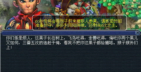 小猴子们攻击未果,孙悟空亲自出马,将人参果树砸坏,我们需要进入古树之心寻找古树之魂,驱赶它的心魔。队员5人进入的虽是同样的场景,但左上角的坐标名称显示的却都不一样哦,每个队员要找到一个符咒并找到星星标志的地方使用符咒,每人只可以放一次符咒。5个队员身处的地方分别是古树之心、古树之叶、古树之茎、古树之根、古树之枝。(如果你看到了一个星星,那么这个星星就是让你用来放符咒的,别的队员是看不到你的星星的,相反你也一样看不到他们的。)