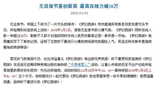 梦幻西游在这一年进入到了冲刺阶段,所有的成绩,都可以体现在了统计出来的数据上。就在这年的5月份,梦幻西游和大话西游2的总在线人数突破了100万大关。可是所有人都低估了梦幻西游的能量。就在2005年年关的时候,100万的这个数字,已经独自属于了这个诞生仅仅2年游戏。在那年的年底,化境资料片的推出,不仅没有赶走基数已经很庞大的玩家群体,反而将梦幻西游的玩家群体推向了一个新的高峰。