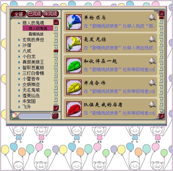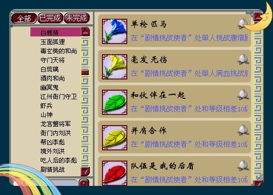 剧情成就涉及到每一场需要打斗的场面,具体又分为在剧情挑战使者处单挑玄奘身世剧情白鹿精成功