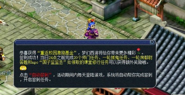 3、活动期间内玩家一旦满足连续签到天数奖励,便会收到系统邮件通知前往长安城(307,200)处找npc“国子监监丞”领奖,奖励保留至活动结束;