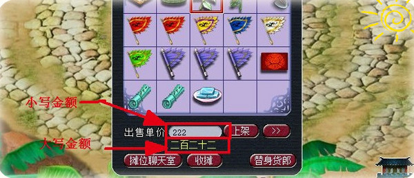 3、为避免摆摊上架出现误操作的情况,摆摊设置调整为上架时输入金额会增加数字汉字提示,在部分服务器测试;