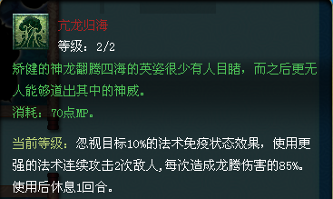 海龙的经脉最大的亮点就是“忽视”,最大亮点就是忽视法术减免(比如罗汉,法防这类的法术减免状态),有增加镇海珠忽视灵力的加成。