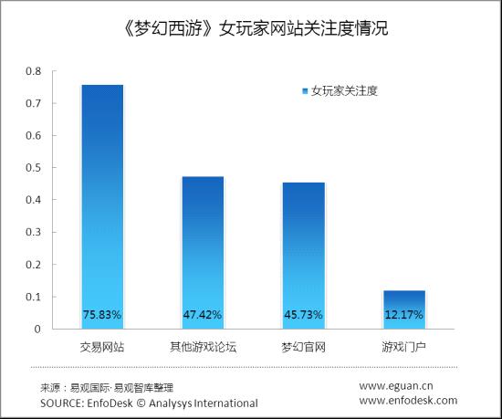 75%以上的女玩家都热衷于逛交易网站,这是女性玩家区别于广泛的玩家群体的一个重要特性。另外调查显示,在女玩家最关注的综艺节目中,《中国好声音》和《快乐大本营》位居前二位,其中值得一提的是《梦幻西游》为玩家打造的一档综艺秀节目《梦幻来了》备受关注,排名第三。