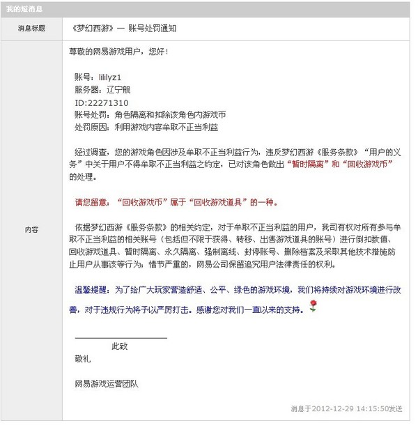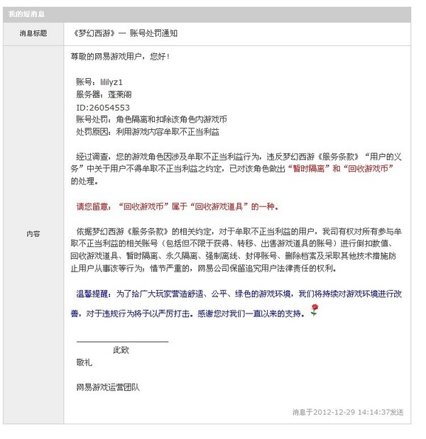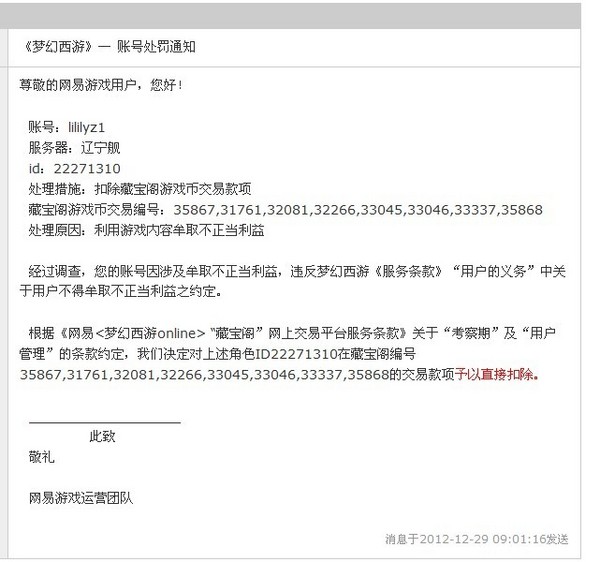 宝儿说:(2012-12-29 12:12:53)经过调查,您的账号因涉及牟取不正当利益,违反梦幻西游《服务条款》“用户的义务”中关于用户不得牟取不正当利益之约定。