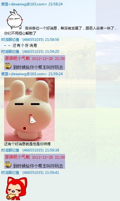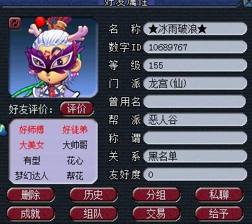 在2012年8月31号,我新建了一个帮派叫雾中楼,两个月前,不玩梦幻了把手上的号送给了表妹玩,就在12月29号,她不想管这个帮派,帮里也没人要,经过我同意后她发世界找个帮主把这帮派送人,就这样小气概开了个145的小号夜小宇进了雾中楼准备接帮派