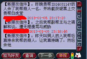 商人对于一个帮派来说,至关重要。如果一个帮的商人被杀,那么后果相当严重.下面就是一个帮的商人被杀后,帮派的外交发言人处理该事件的全部截图,只有说,这人太有才了。