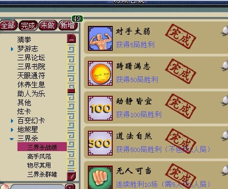 小二:是的。不是五开党的玩家只需要知道4个门派是干吗的,经常进入三界游戏直接退出就可以,坚持一段时间,也可以轻松搞个20来点成就。里面有劫主、护法、凶灵、散修四类,劫主就是老大,他不可以死,他一死就结束游戏;护法是保护劫主的,一起输一起赢那种;凶灵的任务就是杀掉劫主,劫主死了你就赢了;散修是最苦命的一个人,他要把全部的人都杀了才算赢。里面的牌吧,看起来好多,你都不用管它是干嘛的,你只要知道“攻”就可以,你就出“攻”打人,对方掉血了就可以,打的别人没血你就赢了。这个自己打几次就会了,别想得太复杂,“桃”是加血的,“丹”的话吃了打人多一点血,每个武器都有说明,很简单。前两天还给我老婆的号刷,六个小时左右120来点成就吧。