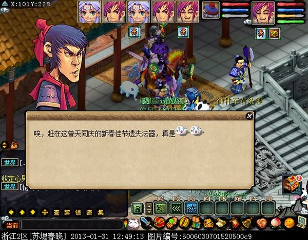 活动介绍:春节活动期间,玩家(等级≥30级,队伍人数≥3)在位于长安城(230,120)的新春老人处领取任务。每环任务由3-4个小任务组成,4环为一轮。玩家根据系统提示和指引完成任务即可获得丰厚奖励。