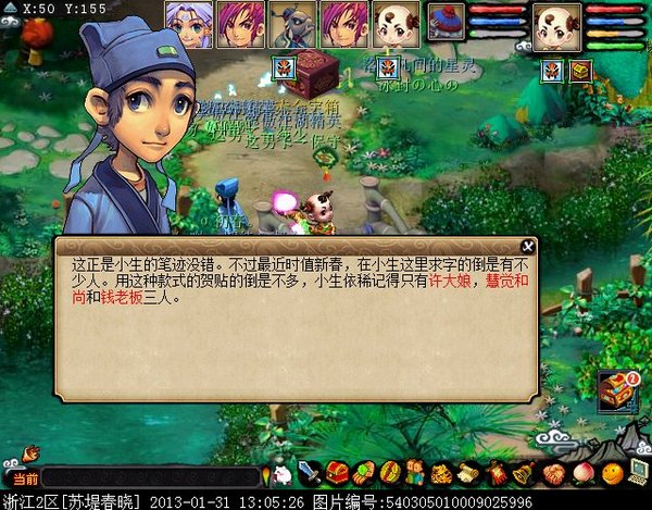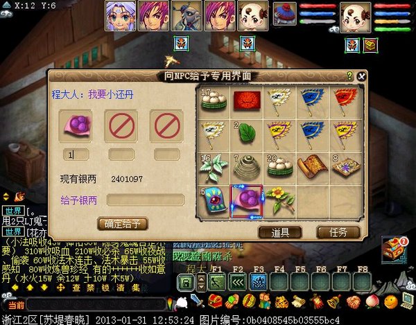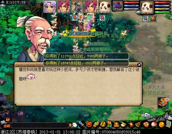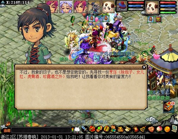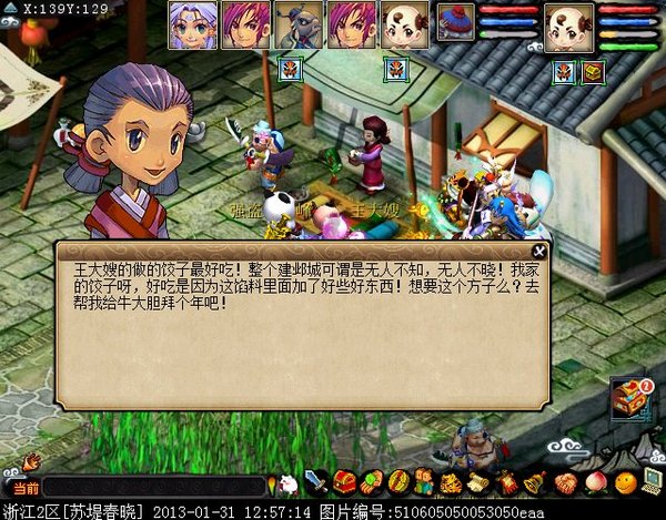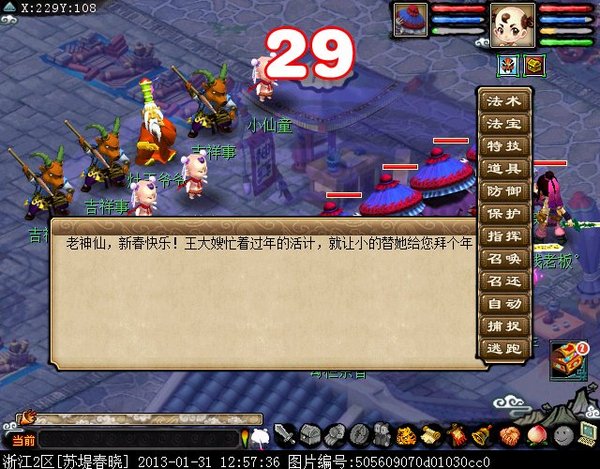 找到王大娘后,大娘让你去找建邺的牛大胆,切入战斗。灶王爷爷是MW,还会给自己顶药加血,仙童和吉祥是封系门派,FC,PS,NR,主要干扰输出,怪物血不多,难度不大。战斗结束,告诉王大娘,又要打架了。