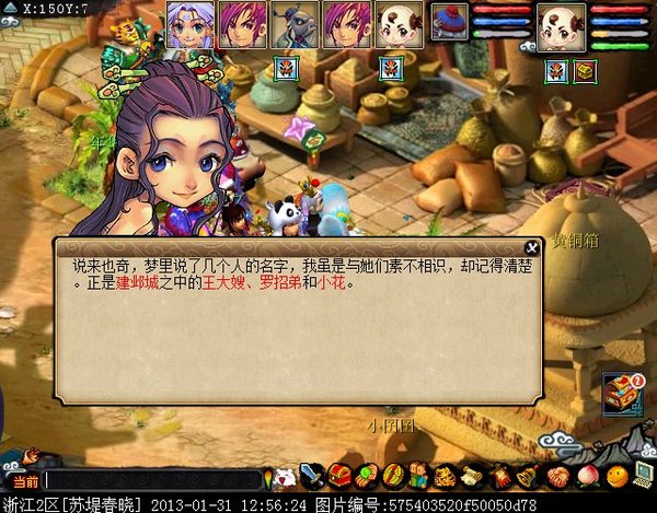 先找到朱紫国的豆蔻,她会让你在建邺中找王大娘,罗招弟或者小花,这里要注意的是并不需要每一个都找啊,只要找到能成功触发下面任务的就可以了,一般找1-2次就可以了。王大娘和小花都会触发两个的战斗,罗招弟会要一个烹饪,触发一次战斗。如果随身带烹饪比如,烤鸭,烤肉之类的,推荐先找罗招弟,如果没有触发下面的任务,再找小花,最后是王大娘,因为王大娘的两场战斗,是还带有找人性质的,所有时间上会慢些。